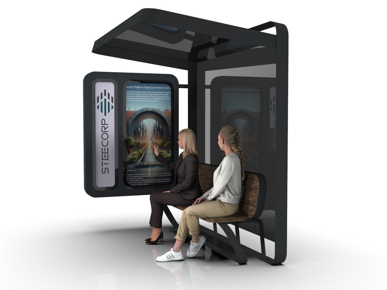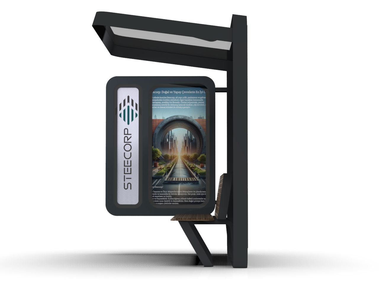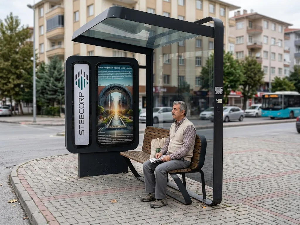 STEECORP Otobüs Durağı, şehir estetiğini teknolojiyle birleştiren modüler bir kent mobilyası çözümüdür. Dayanıklı çelik yapısı ve akıllı şehir entegrasyonu sayesinde yolculara güvenli bir bekleme alanı sunarız.