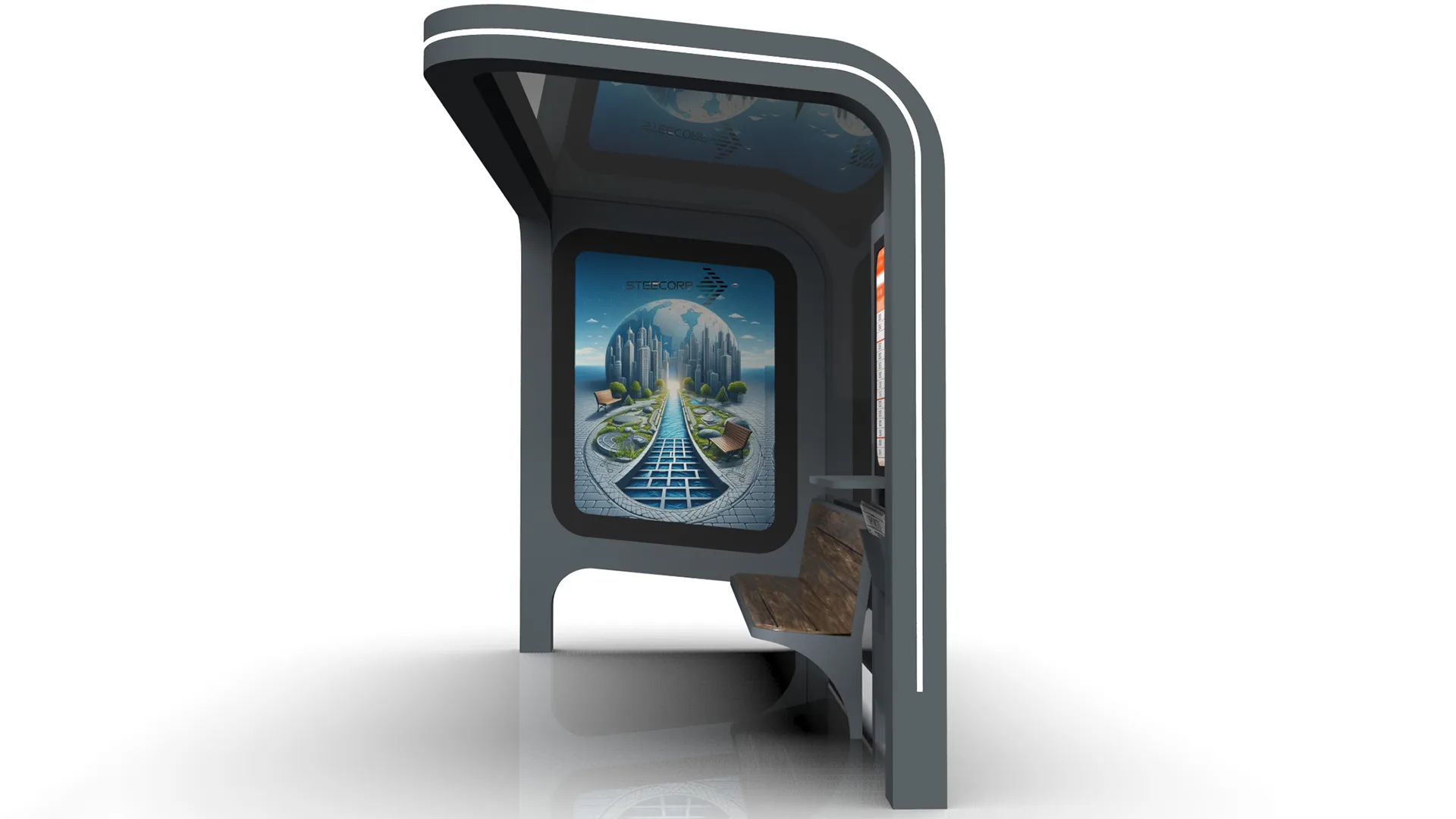 STEECORP Akıllı Otobüs Durağı, dijital bilgilendirme ekranları, Wi-Fi erişimi ve güneş enerjisi desteğiyle donatılmış ileri teknoloji bir kent mobilyası çözümüdür. Şehir estetiğini sürdürülebilirlikle birleştiren bu duraklar, gerçek zamanlı veri akışı sağlayarak akıllı şehir ekosistemlerine tam uyum sağlar.